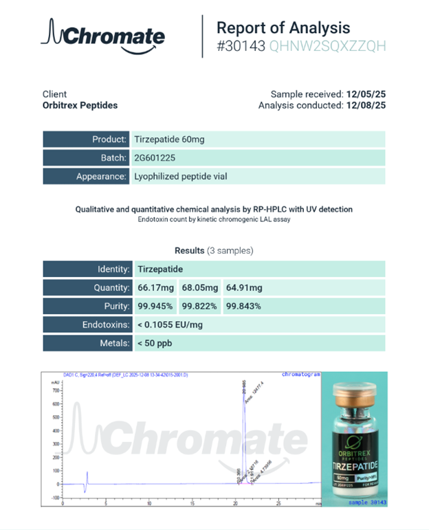 Tirzepatide is supplied strictly for laboratory research use only and is not intended for human consumption, clinical use, or medical treatment.
